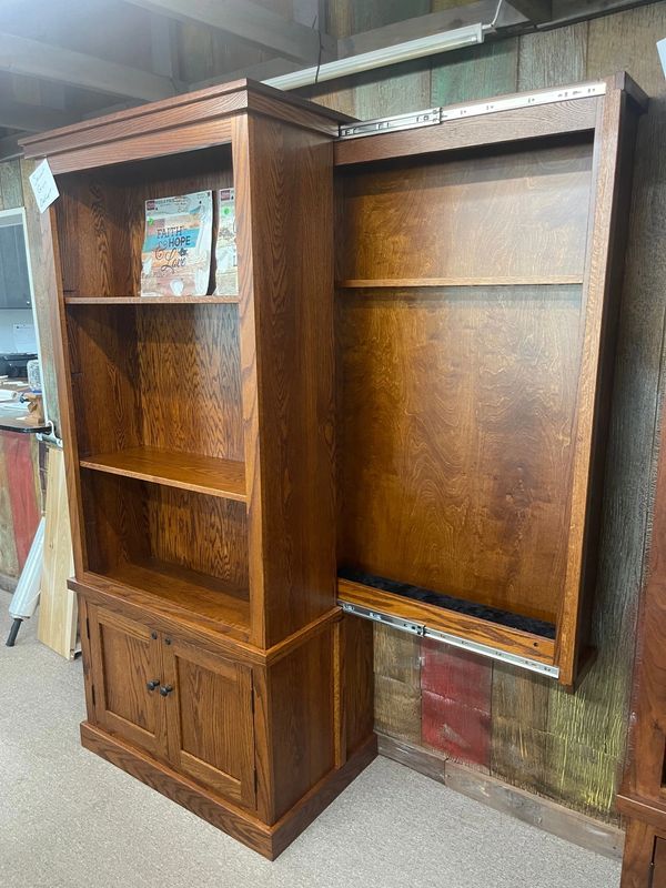 Introducing our stunning Hidden Gun Cabinet Bookcase, the perfect blend of functionality and elegance for any home or office space. Crafted with meticulous attention to detail, this wooden bookcase seamlessly combines the timeless beauty of cherry wood with a hidden compartment for your firearms.