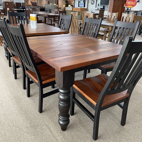 Our Timber Mill Collection showcases a stunning table with six accompanying chairs. The focal point of any room, this dining set exudes rustic charm and timeless beauty. The expertly crafted reclaimed barn wood exudes a rich history, boasting unique textures and natural imperfections that add character to your space.